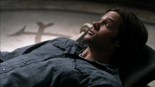 In an effort to detox Sam from his addiction to Demon blood he is locked in a panic room where he hallucinates he is being tortured (here with the chin strap that could so easily have been a proper gag). He also has a seizure (hence the belt) and then is chained to a bed. A veritable feast of Jared bondage!