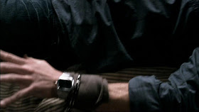 In an effort to detox Sam from his addiction to Demon blood he is locked in a panic room where he hallucinates he is being tortured (here with the chin strap that could so easily have been a proper gag). He also has a seizure (hence the belt) and then is chained to a bed. A veritable feast of Jared bondage!